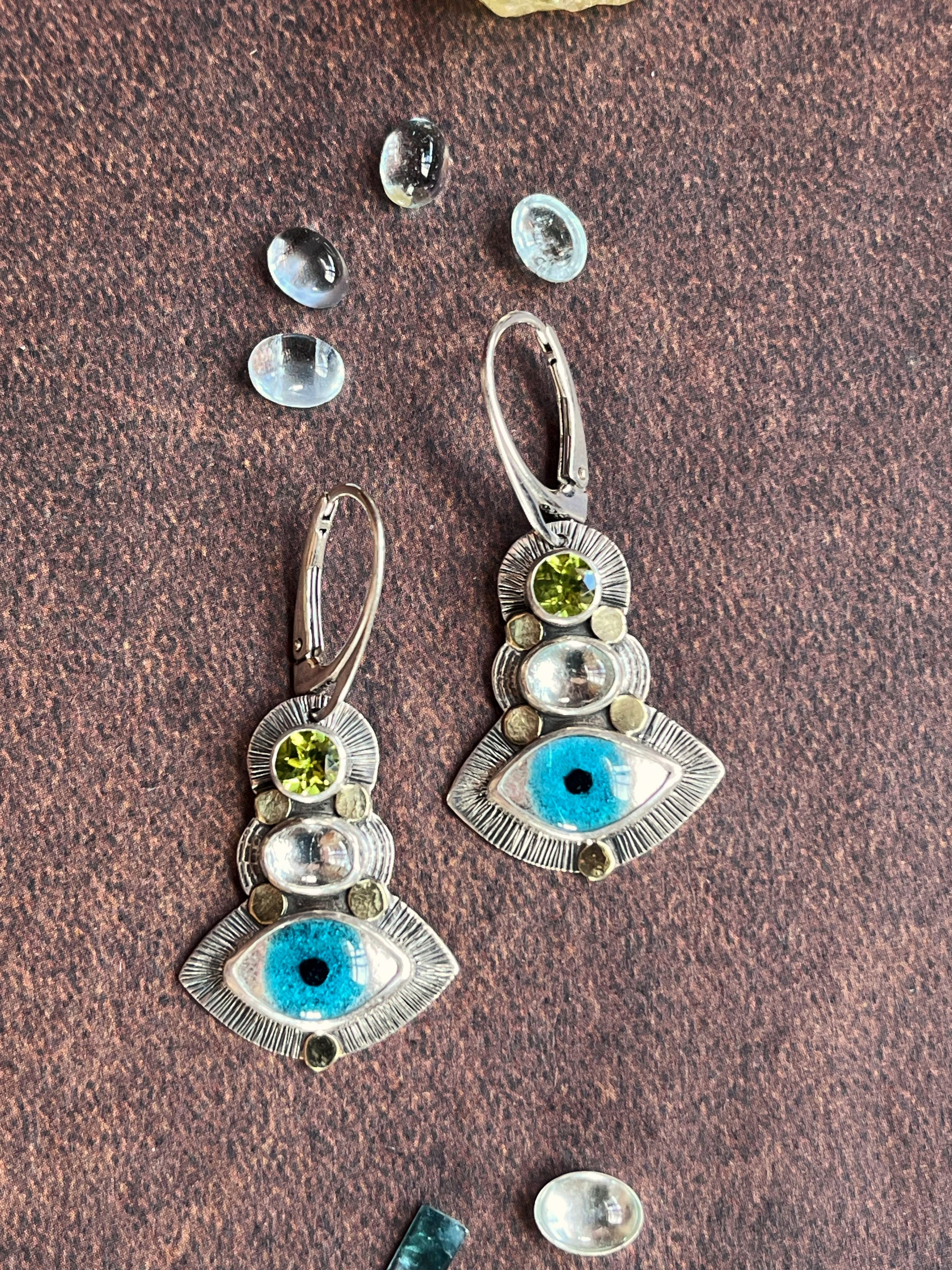 The glass enamel eyes are set in sterling silver with 18k gold accents. The stones are Aquamarine (March Birthstone) and Peridot (August Birthstone). The lever backs are sterling silver.