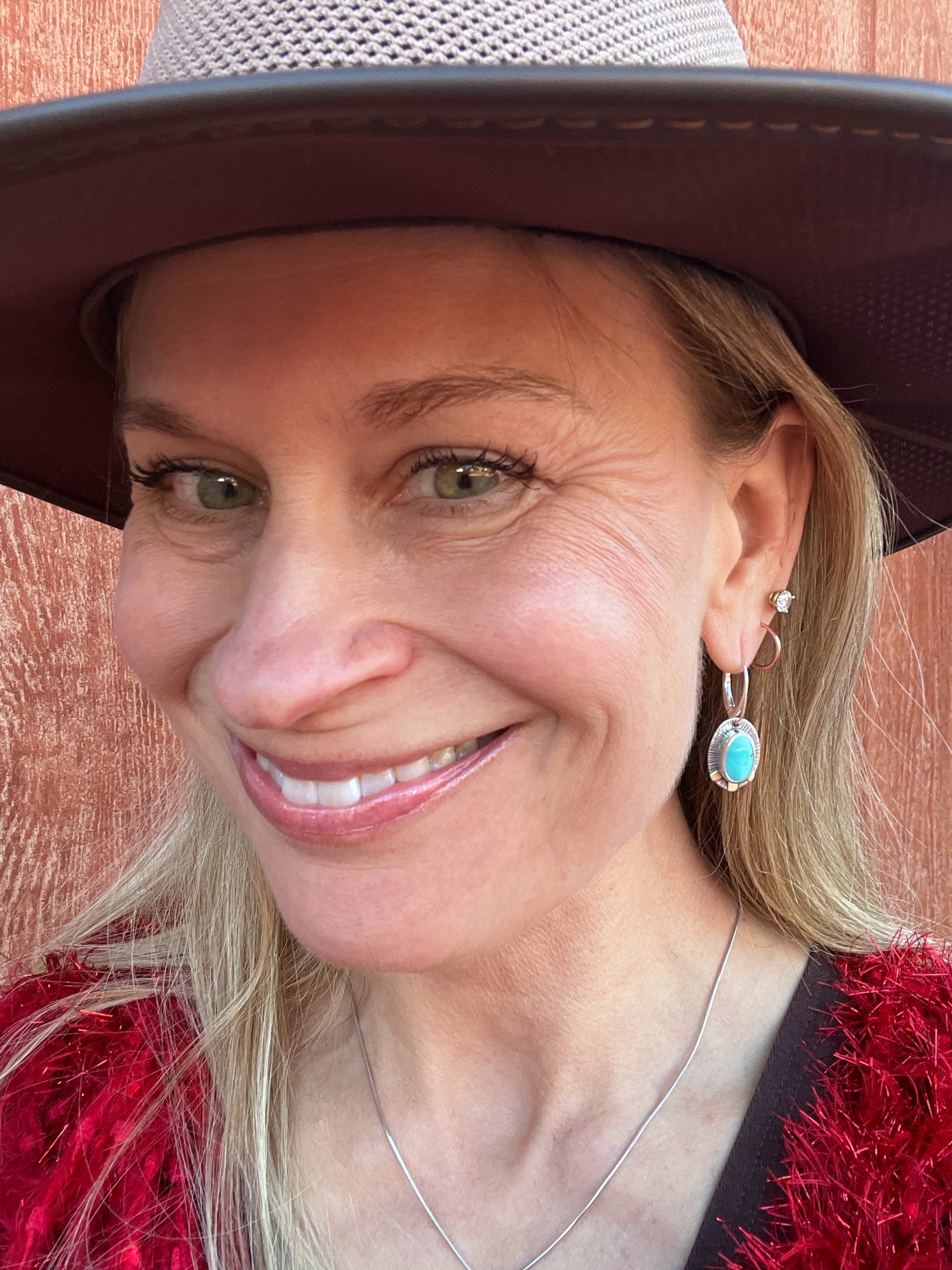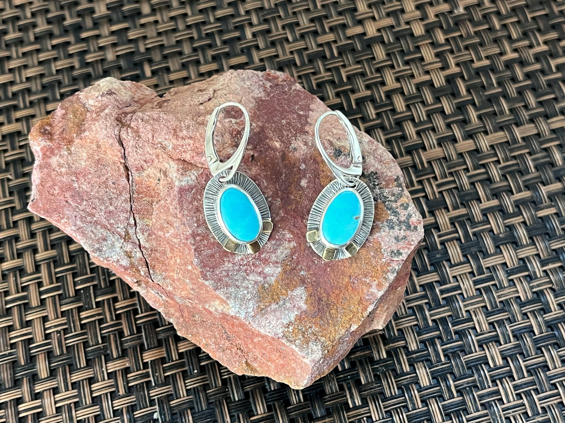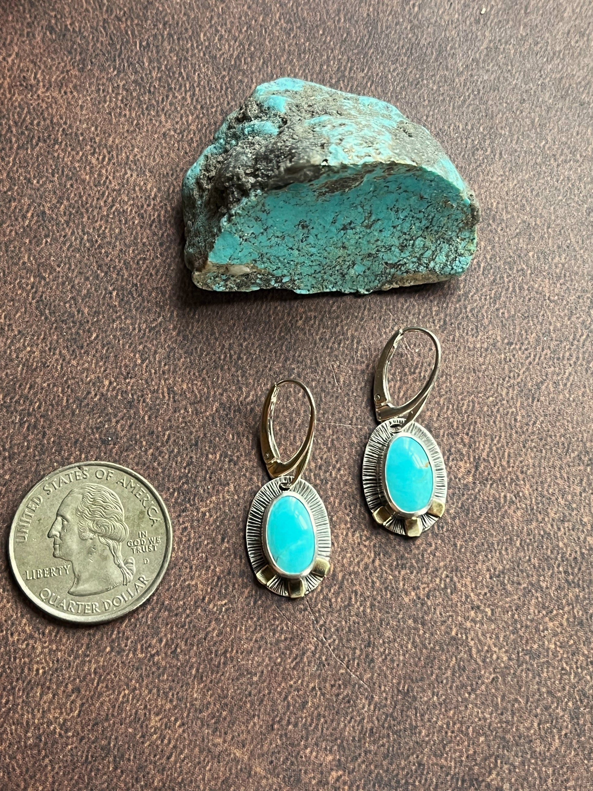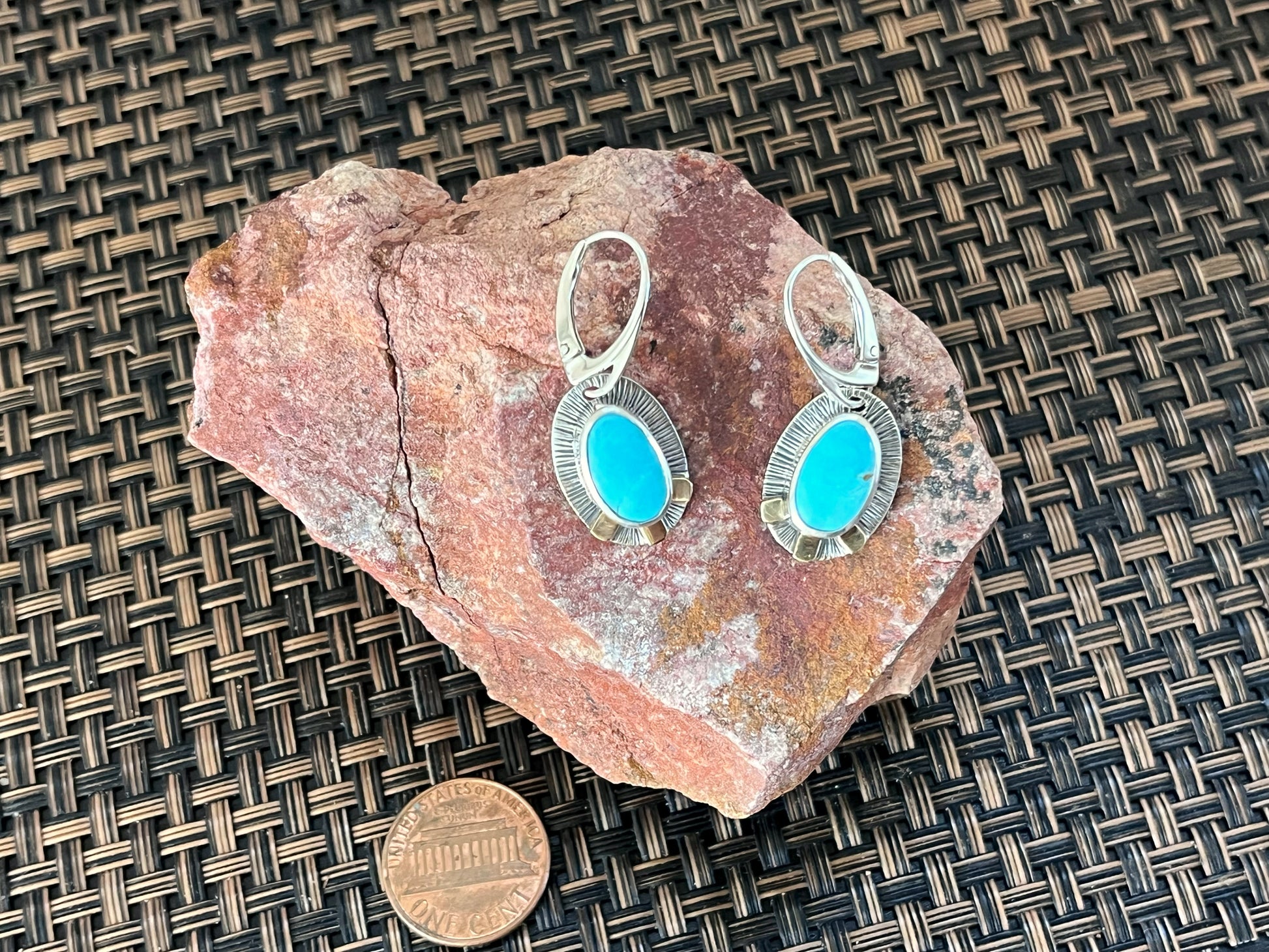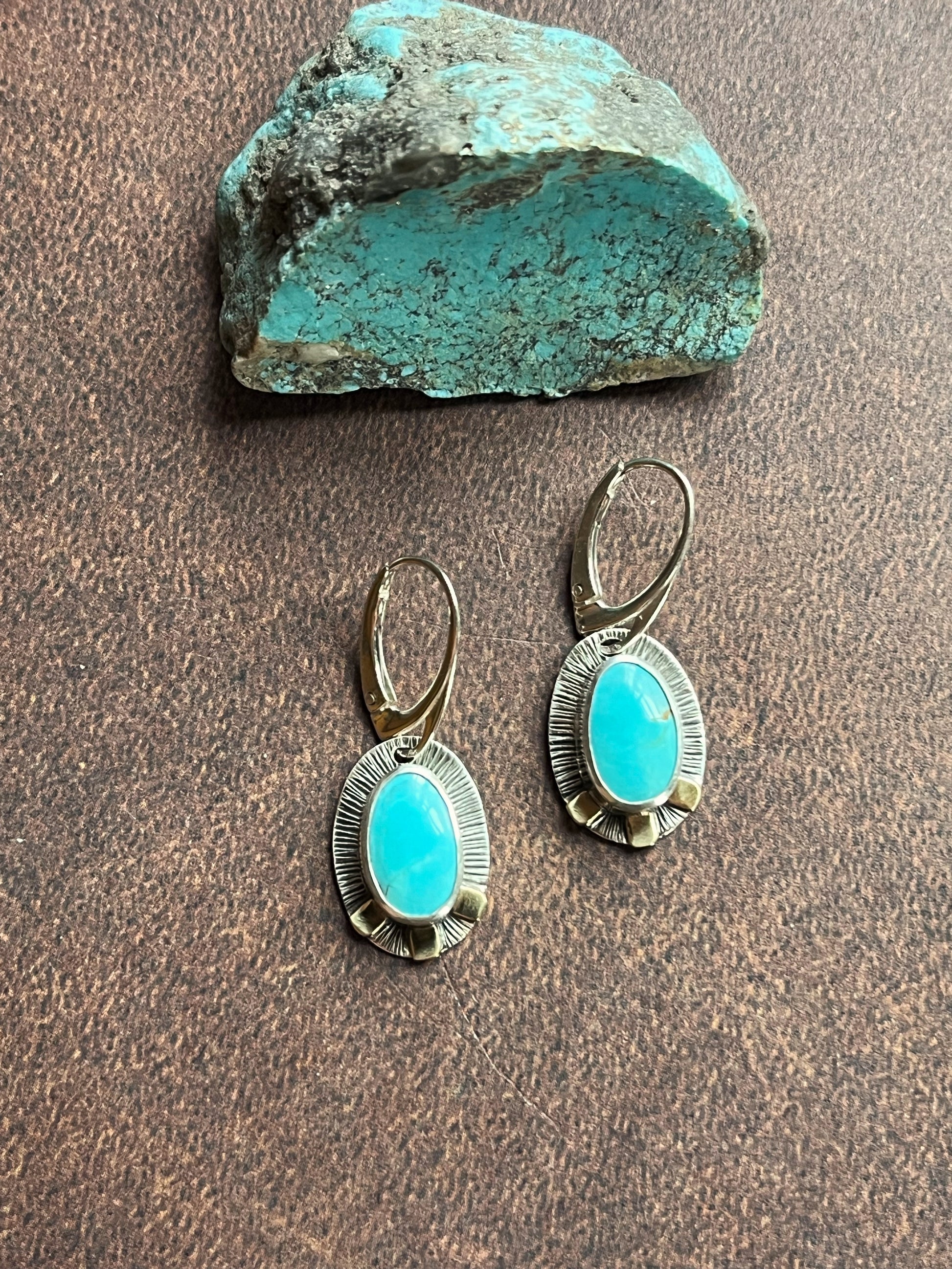 Chilean Turquoise is set in sterling silver with 14k solid gold accents. The lever backs are sterling silver.