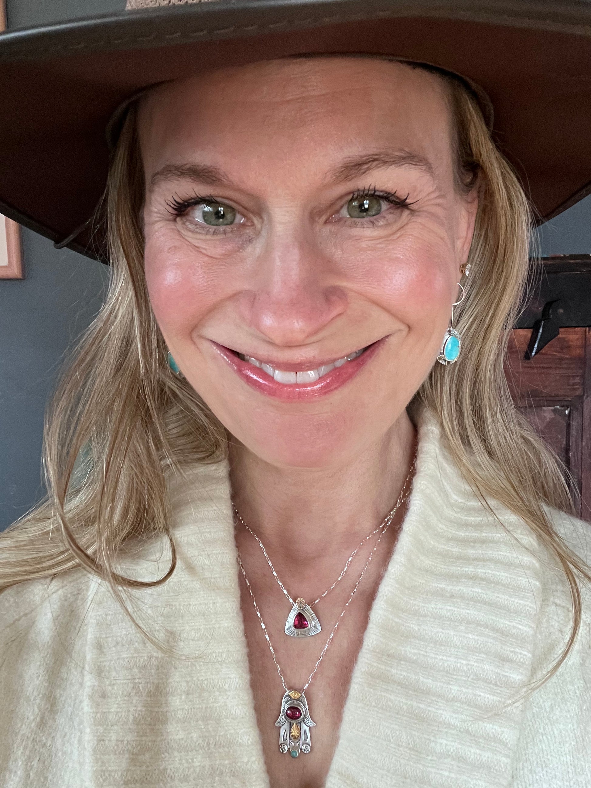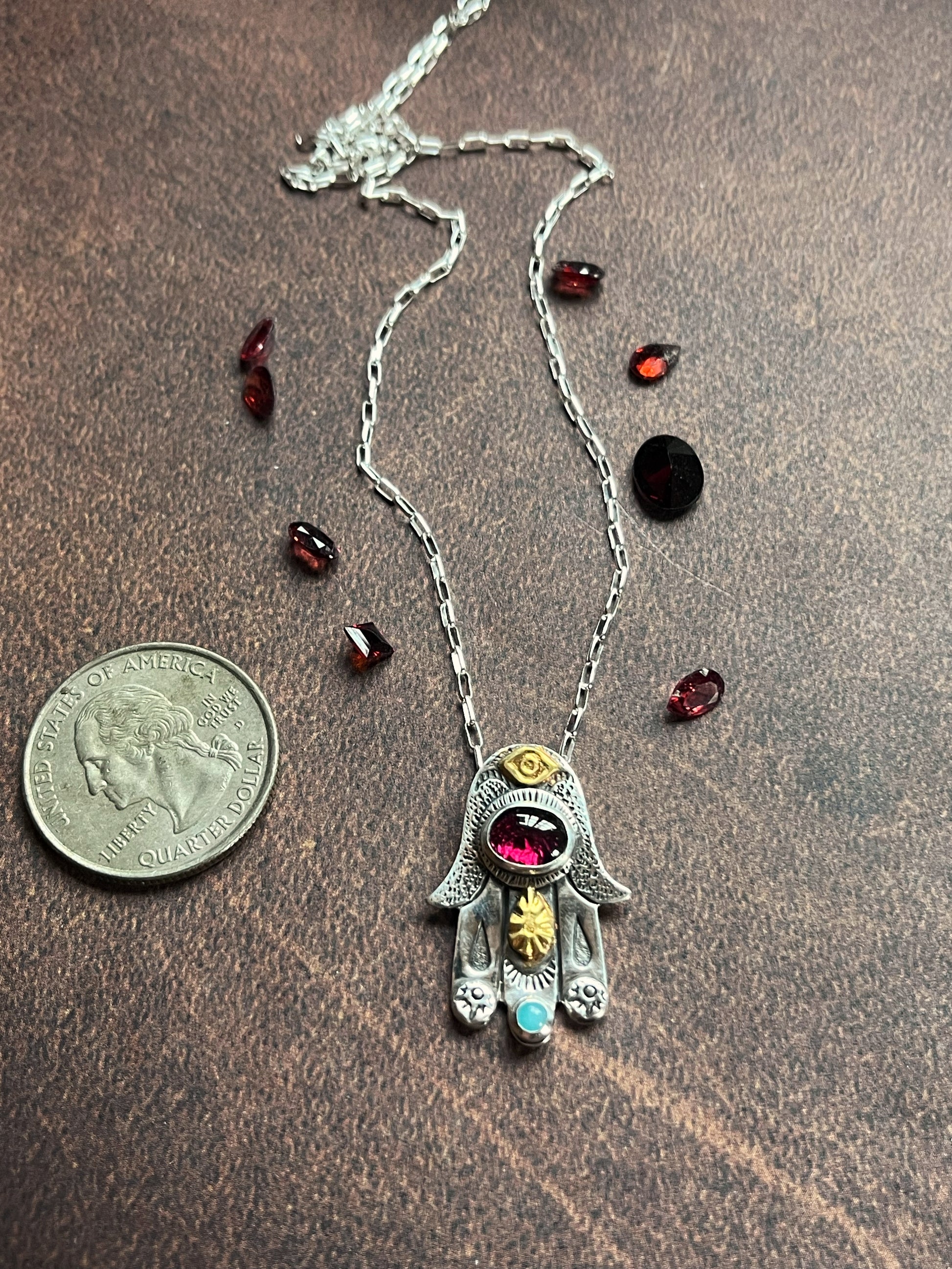 The stones are Rhodolite Garnet (January’s birthstone) and Amazonite. The chain is 18” and sterling silver.