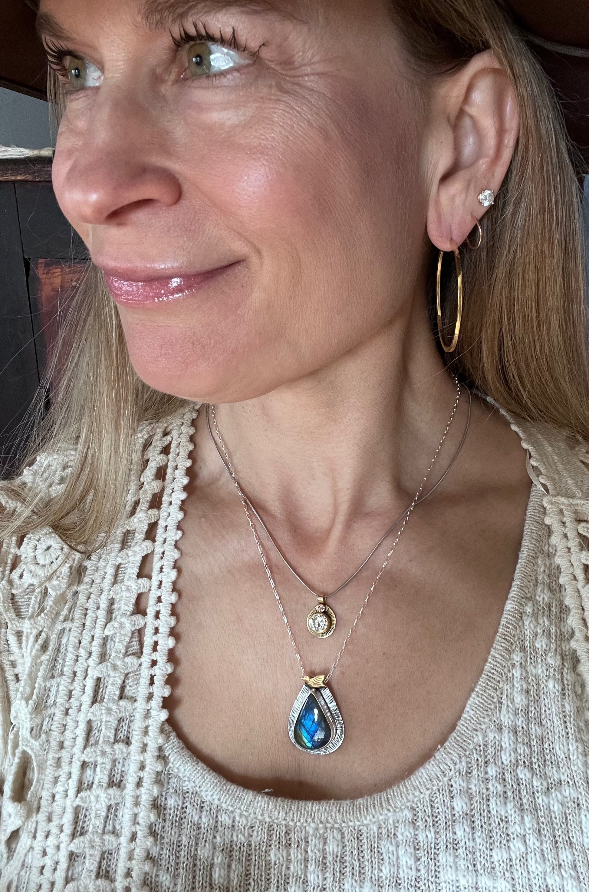 Labradorite is set in a sterling silver with a handmade bird embellishment with gilded 24 karat gold. Using the Korean technique Keum Boo allows 24 karat gold to marry sterling silver creating a two tone masterpiece.