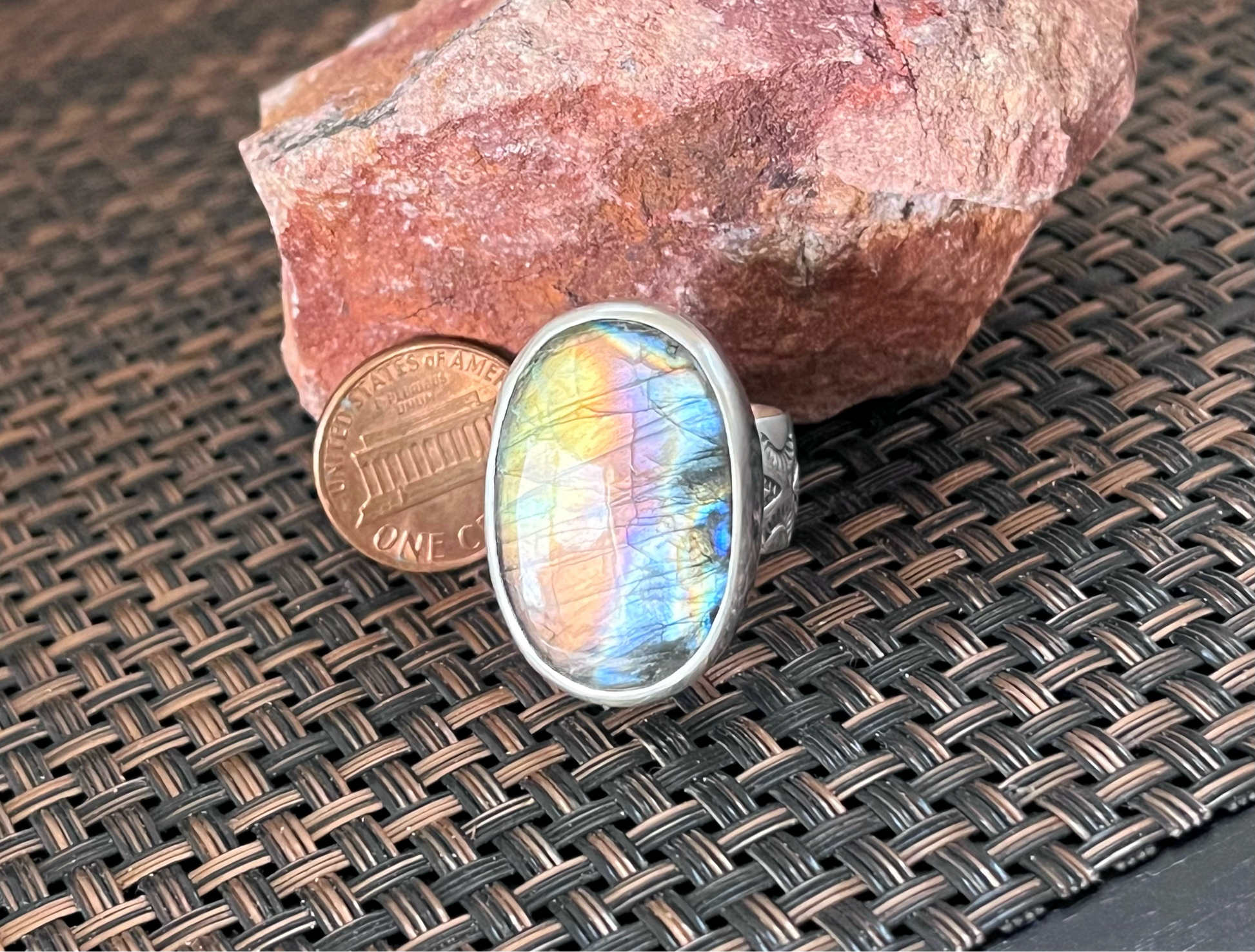 The Labradorite is 3/4”W x 1 1/8”L