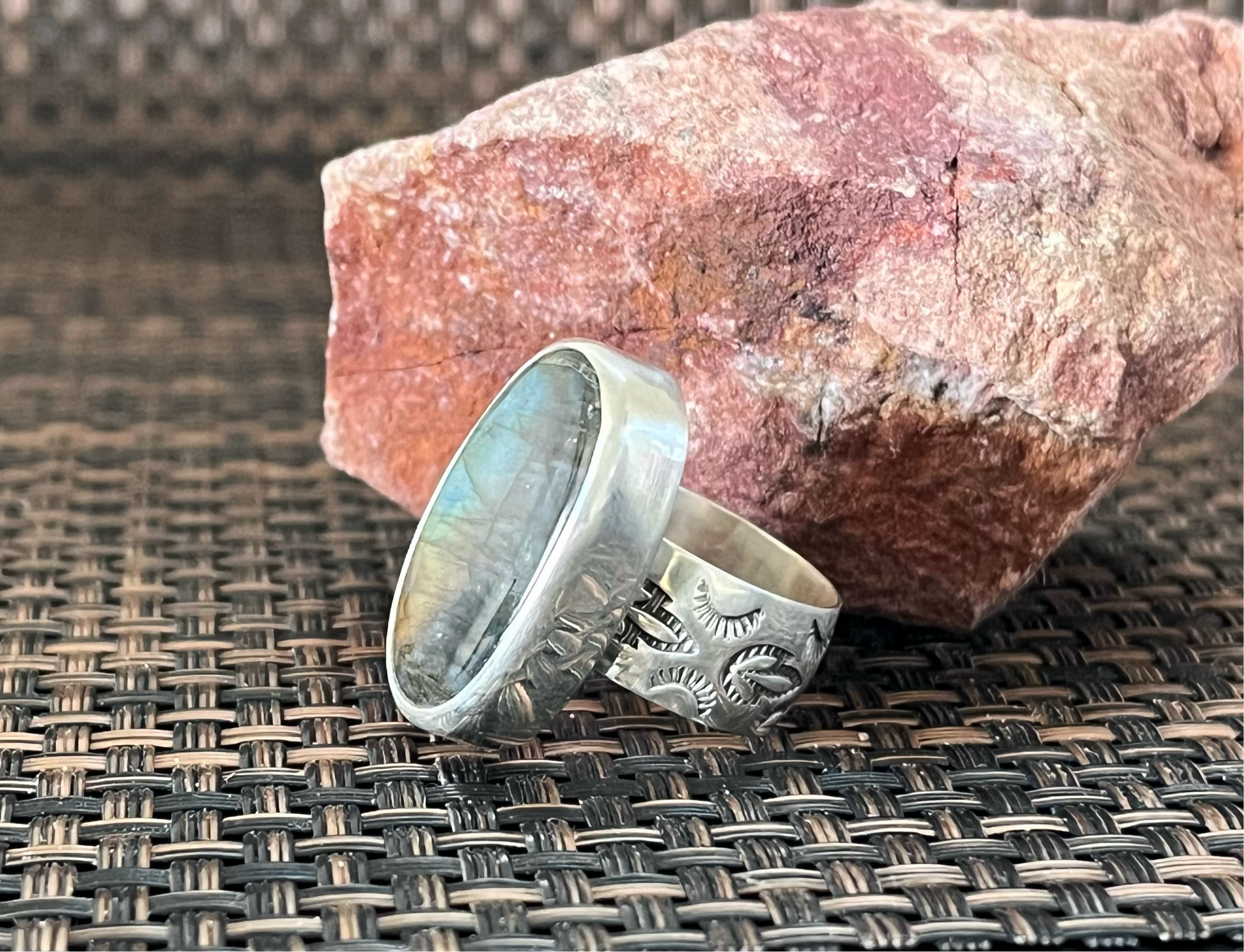 Oval Labradorite is set in a handmade chunky sterling silver statement ring with a wide hand stamped ring band.