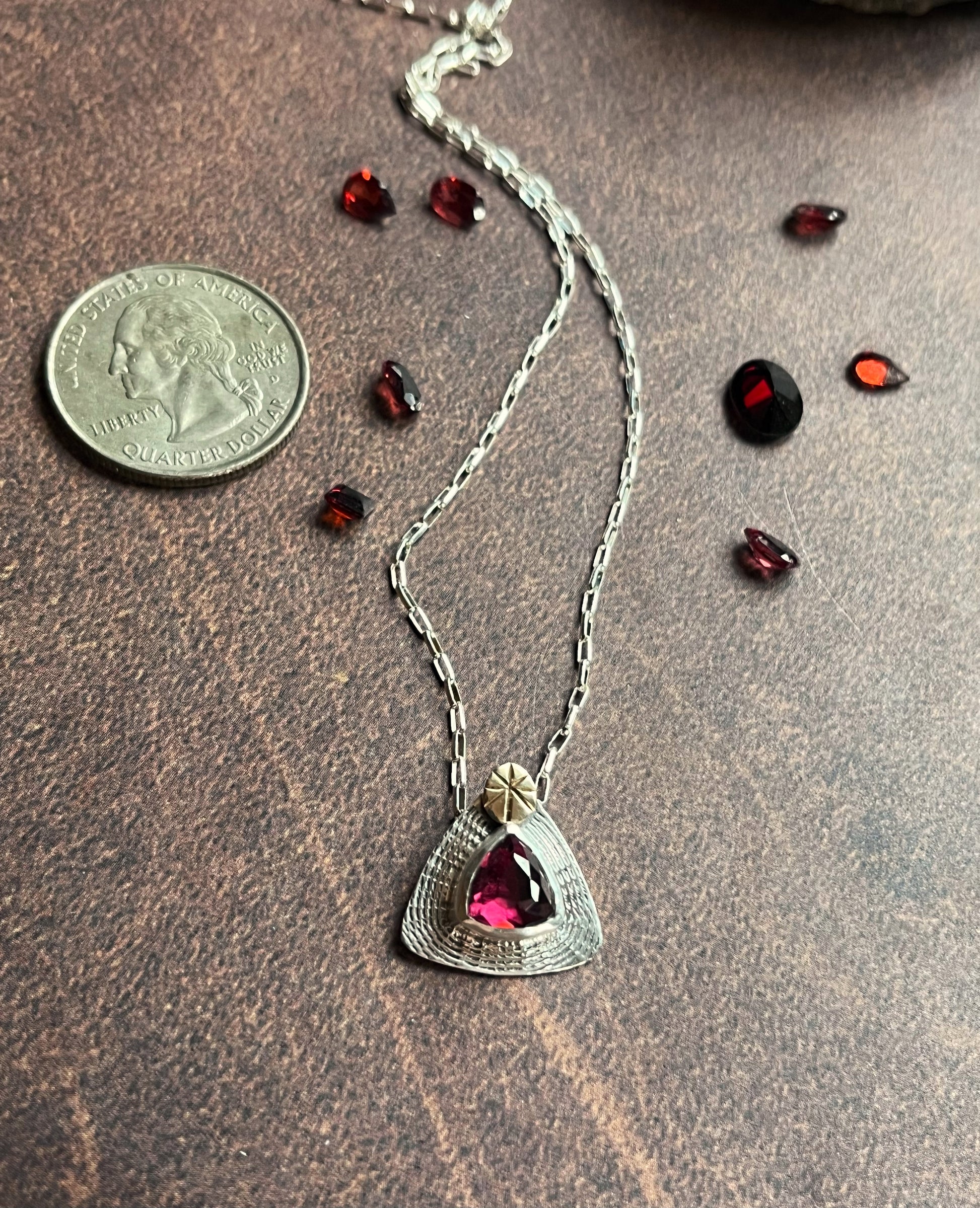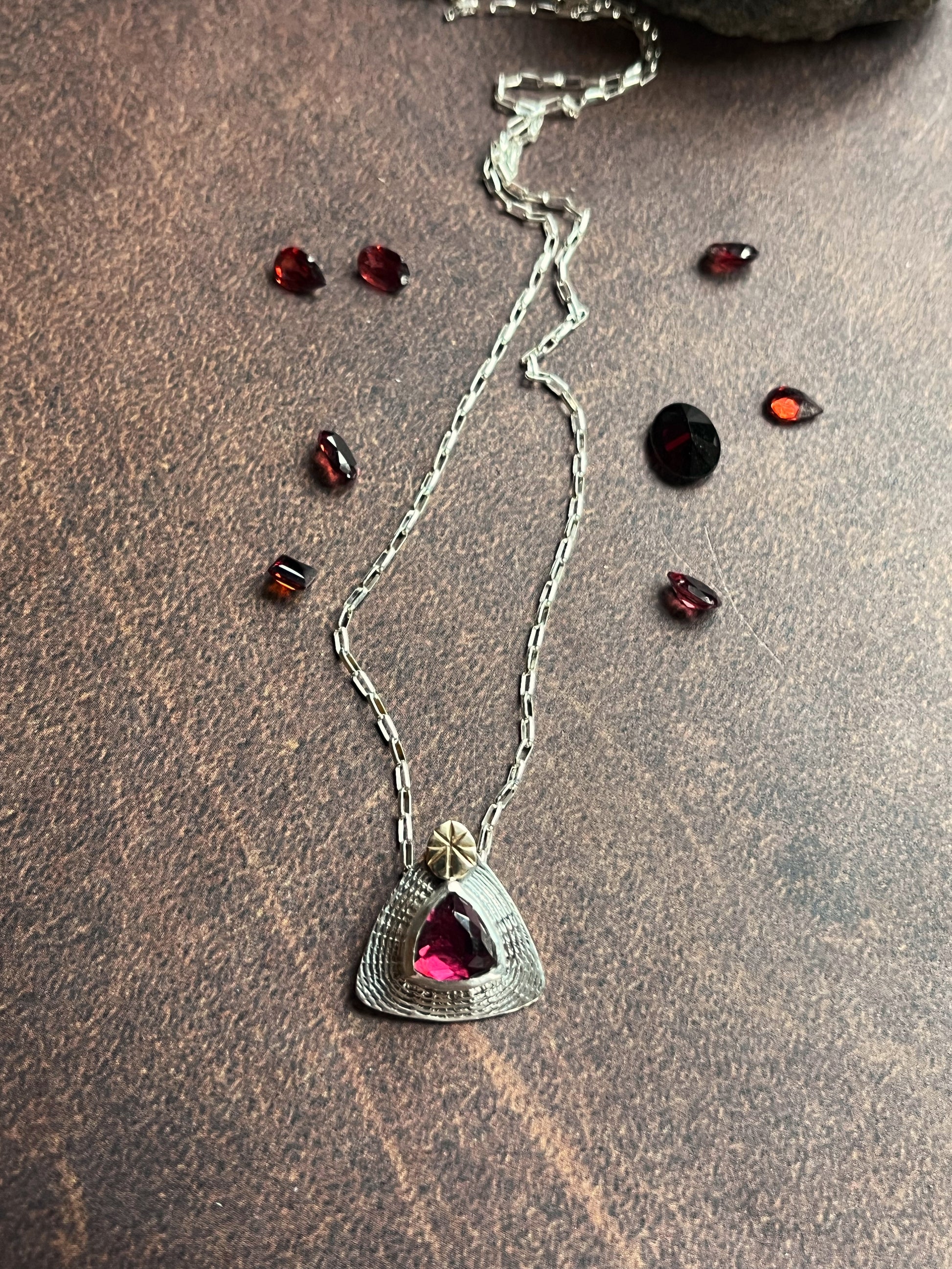 Rose cut Rhodolite Garnet is set in sterling silver with a solid 14 karat gold accent.