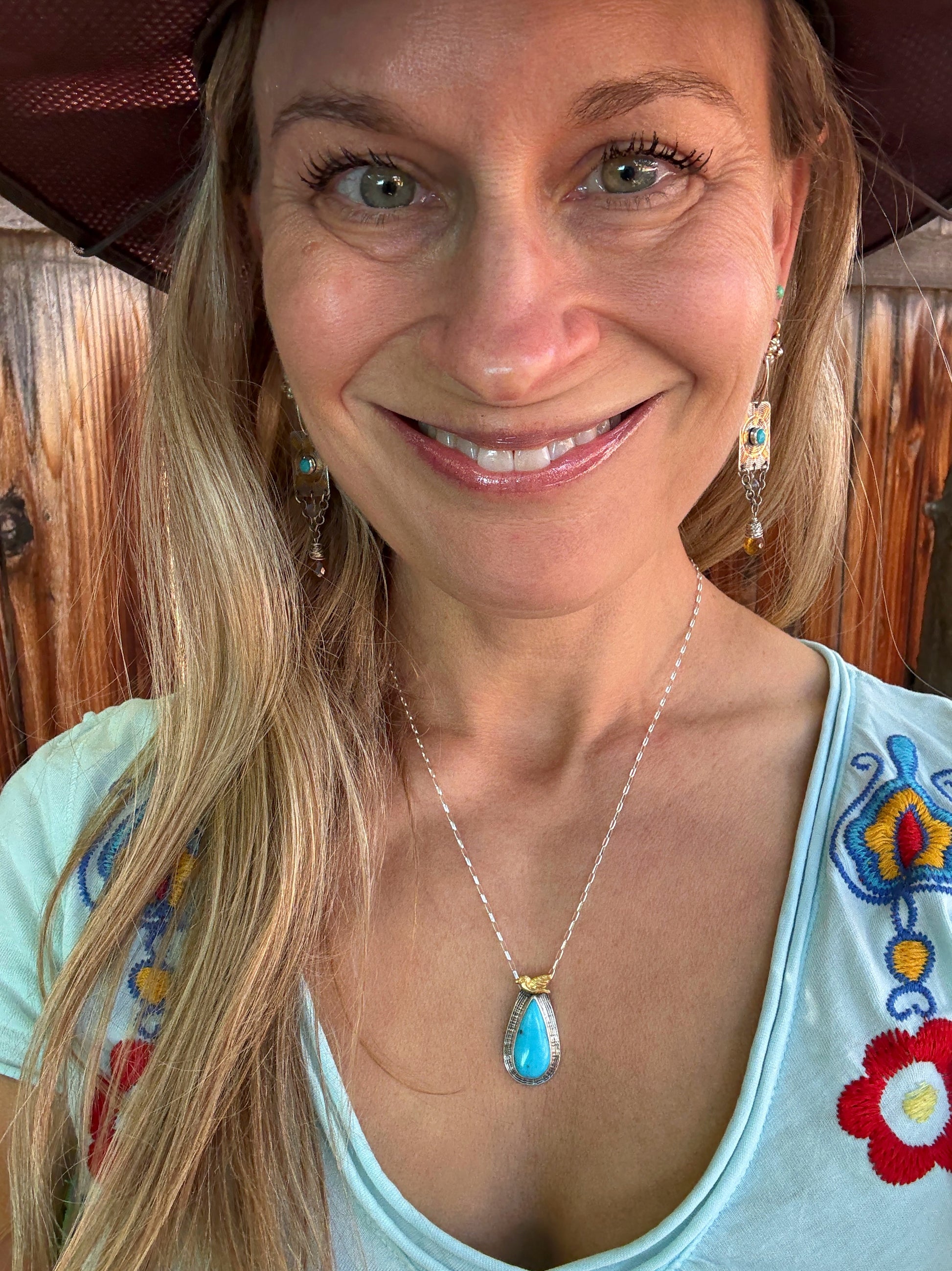 This necklace features a Sleeping Beauty turquoise teardrop set in sterling silver with hand stamped details. A 24k Keum boo gold bird rests above the stone adding symbolism of freedom and joy. The pendant hangs from a sterling silver chain making it a timeless piece that carries the beauty of sky and song.