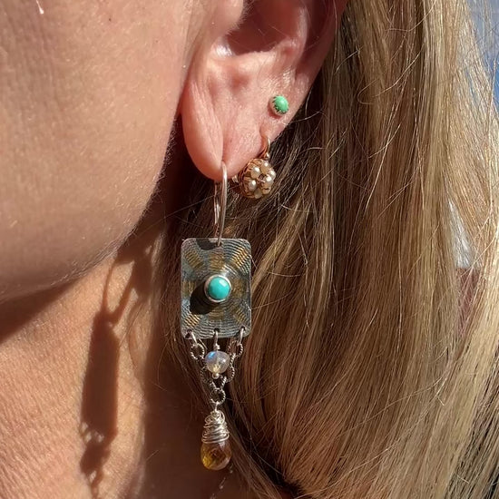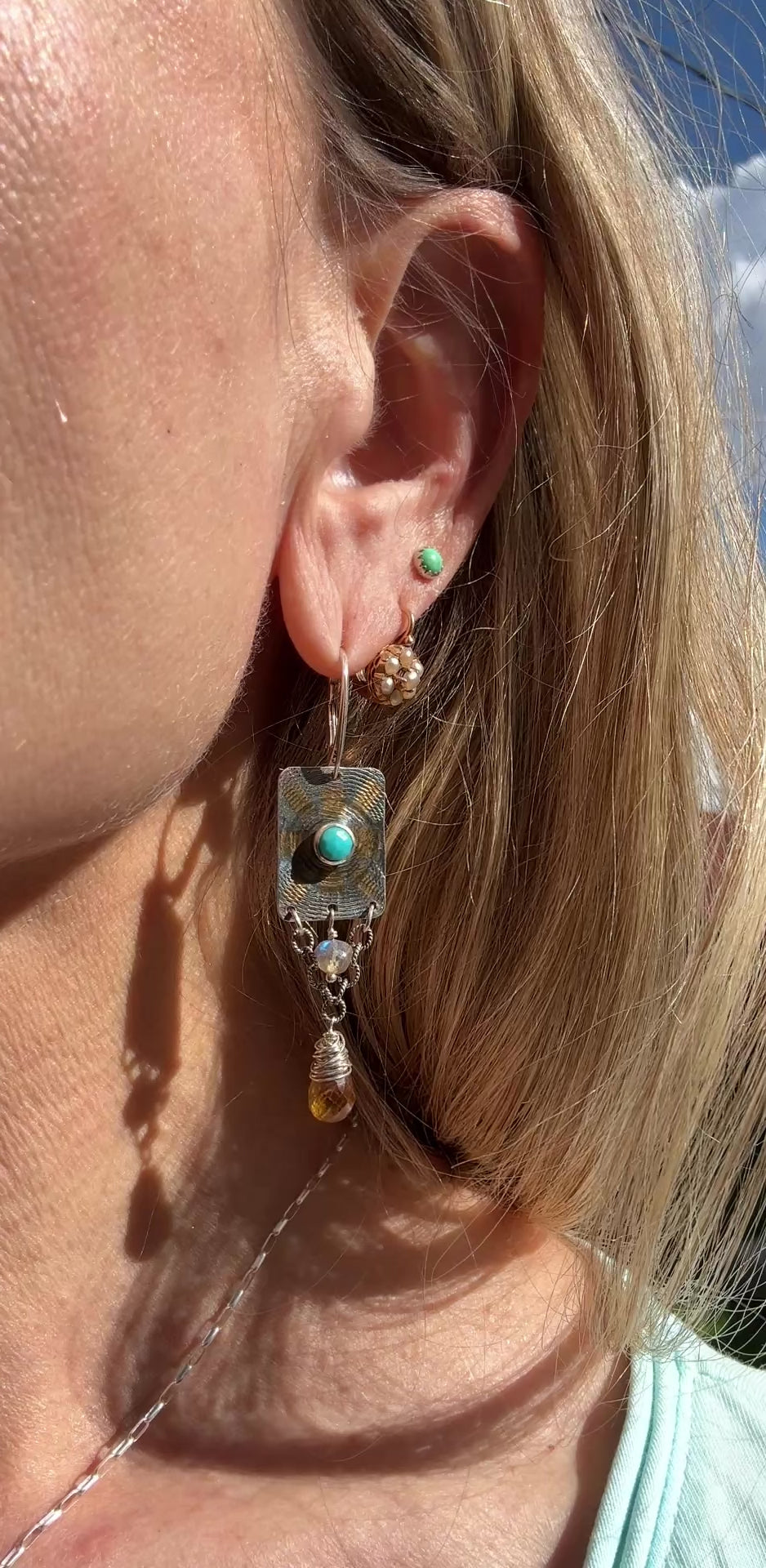 These earrings embody strength and light like shields for the spirit. Sterling silver panels are accented with 24k gold Keum boo around vivid turquoise cabochons. Faceted labradorite adds a subtle flash while golden grossular garnet briolettes bring warmth and grounding. A luminous pairing of beauty and protection.